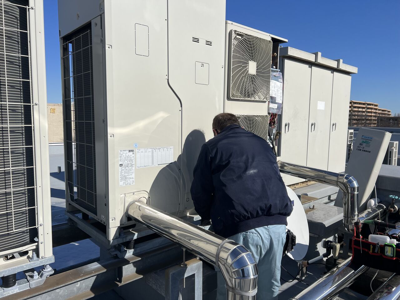 空調点検の場合、室外機は屋外だし、しかも屋上に設置されていることが多いので、夏でも冬でもちょっと大変です。